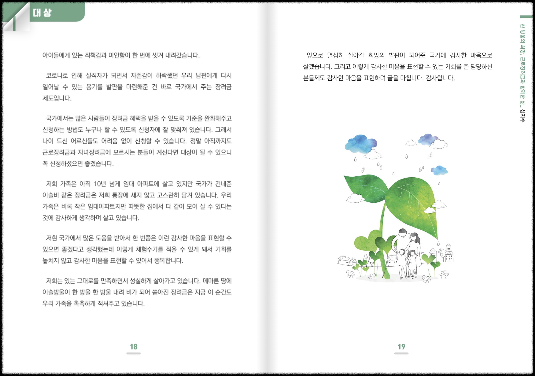 국세청은 어려운 여건에서도 좌절하지 않고 역경을 이겨낸 수급자들의 다양하고 생생한 목소리를 많은 분들과 공유하기 위해 수기🔍를 공모하고 있습니다. 올해는 수상작을 기존 25편에서 40편까지 확대하여 다양한 수상작품을 전자책(e-book)으로 발간하였습니다.