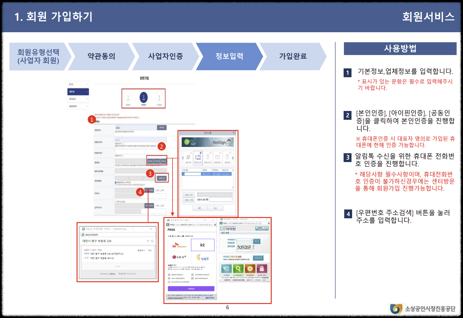 기본 정보와 업체 정보를 입력합니다. 표시가 있는 필수 입력란을 빠짐없이 작성합니다. 기본 정보 입력 본인 인증(아이핀 인증, 공동인증) 절차를 진행합니다. 알림톡 수신을 위한 휴대폰 전화번호 인증을 완료합니다. 우편번호를 검색하여 주소를 입력합니다.