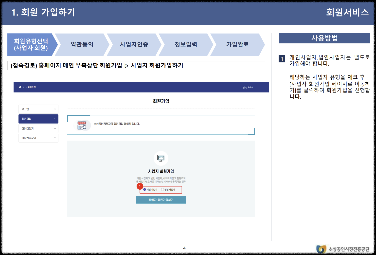 시작하기 먼저, 소상공인시장진흥공단 홈페이지에서 메인 우측 상단의 '회원가입' 버튼을 클릭합니다. 이후 '사업자 회원가입하기'를 선택합니다.