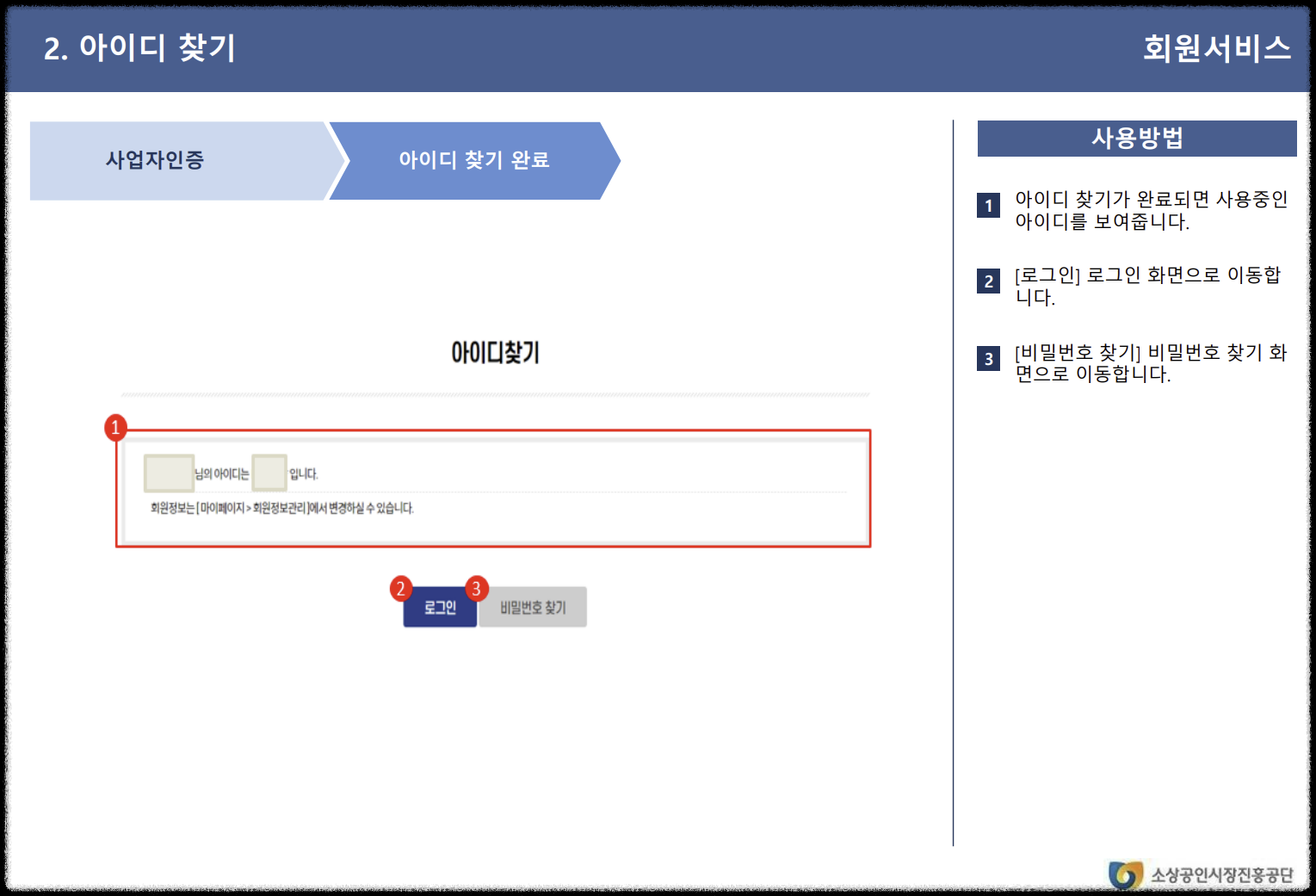 아이디를 잊어버렸을 경우, 홈페이지 메인 우측 상단의 '로그인'을 클릭한 후 '아이디 찾기'를 선택합니다. 본인인증(휴대폰 인증, 아이핀 인증, 공동인증)을 통해 아이디를 찾을 수 있습니다.