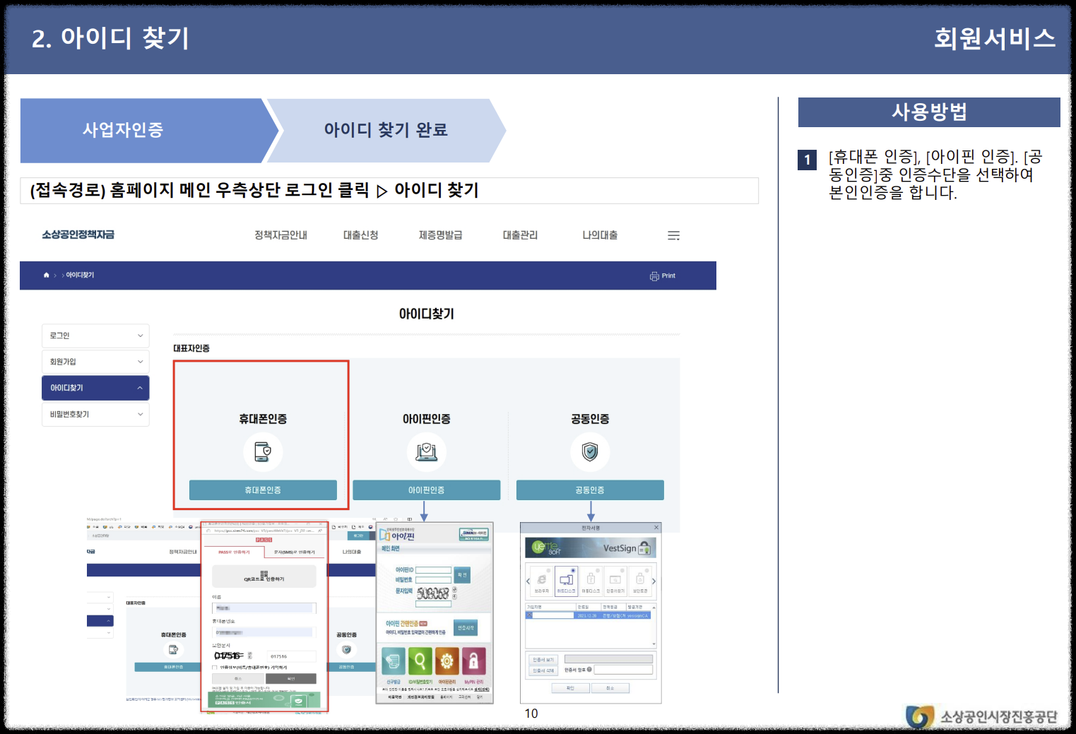 아이디를 잊어버렸을 경우, 홈페이지 메인 우측 상단의 '로그인'을 클릭한 후 '아이디 찾기'를 선택합니다. 본인 인증(휴대폰 인증, 아이핀 인증, 공동인증)을 통해 아이디를 찾을 수 있습니다.