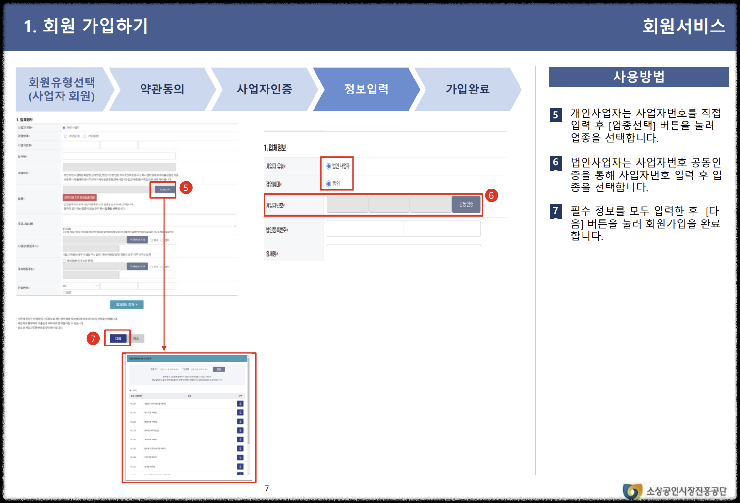 개인사업자는 사업자등록번호를 입력한 후 '업종 선택' 버튼을 눌러 업종을 선택합니다. 법인사업자는 사업자번호와 공동인증을 통해 인증을 완료합니다.