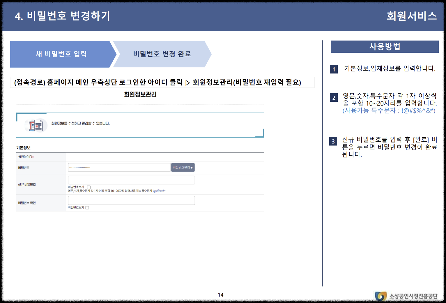 비밀번호를 변경하려면, 로그인 후 '회원정보관리'로 이동하여 비밀번호를 재입력하고 새로운 비밀번호를 설정합니다.