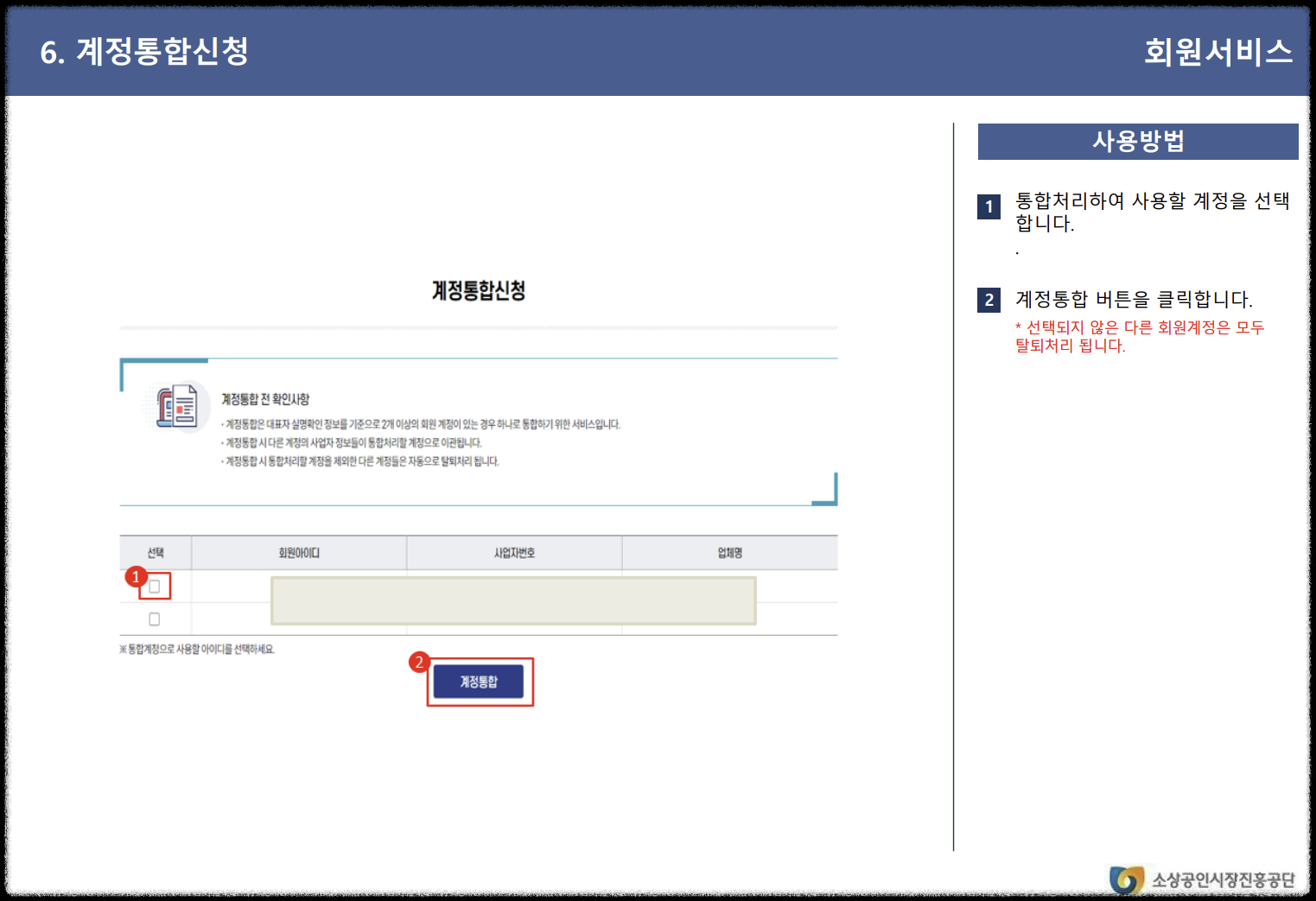 계정 통합은 대표자 명의로 다수의 계정이 있는 경우 하나의 계정으로 통합하기 위한 서비스입니다. 홈페이지 메인 우측 상단의 '계정 통합 신청'을 클릭하여 사용 계정을 선택하고 통합할 수 있습니다.