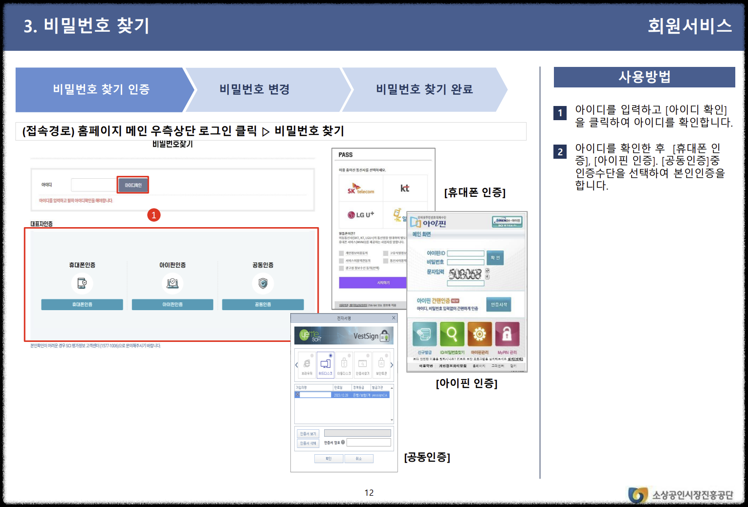 비밀번호를 잊어버렸을 경우, 홈페이지 메인 우측 상단의 '로그인'을 클릭한 후 '비밀번호 찾기'를 선택합니다. 아이디를 입력하고, 본인 인증(휴대폰 인증, 아이핀 인증, 공동인증)을 통해 비밀번호를 재설정할 수 있습니다.