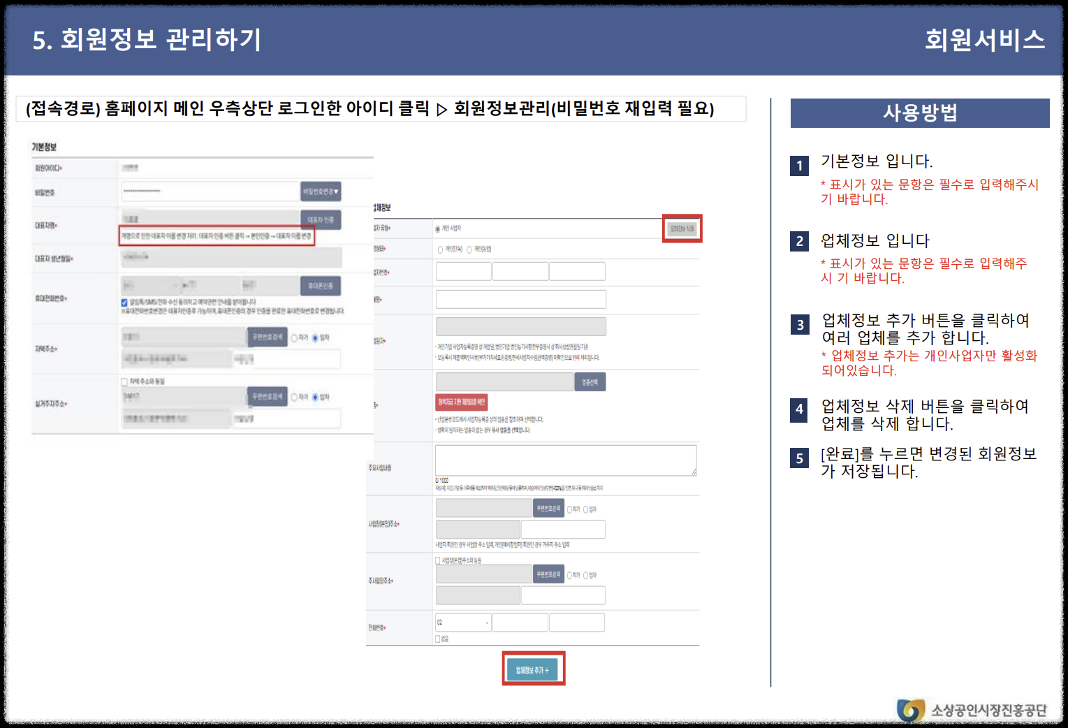 회원정보는 로그인 후 '회원정보관리' 메뉴에서 수정할 수 있습니다. 기본 정보와 업체 정보를 입력하고 필요한 경우 업체 정보를 추가할 수 있습니다.